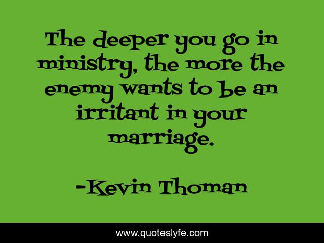 This page presents the quote "The deeper you go in ministry, the more the enemy wants to be an irritant in your marriage.". Author of this quote is Kevin Thoman. This quote is about marriage, ministry,.