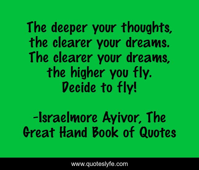This page presents the quote "The deeper your thoughts, the clearer your dreams. The clearer your dreams, the higher you fly. Decide to fly!". Author of this quote is Israelmore Ayivor, The Great Hand Book of Quotes. This quote is about fly, food-for-thought, decide-to-fly, deeper, big-dreams, clear, clearer, deep, thought,.