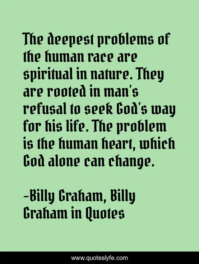 This page presents the quote "The deepest problems of the human race are spiritual in nature. They are rooted in man’s refusal to seek God’s way for his life. The problem is the human heart, which God alone can change.". Author of this quote is Billy Graham, Billy Graham in Quotes. This quote is about human-nature, billy-graham,.