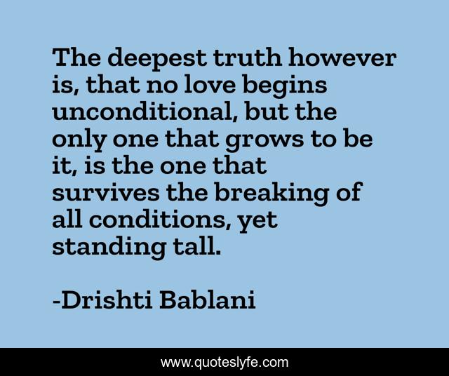 This page presents the quote "The deepest truth however is, that no love begins unconditional, but the only one that grows to be it, is the one that survives the breaking of all conditions, yet standing tall.". Author of this quote is Drishti Bablani. This quote is about true-love, wordions-com, drishti-bablani-poetry, wordions, unconditional-love,.