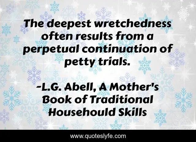 This page presents the quote "The deepest wretchedness often results from a perpetual continuation of petty trials.". Author of this quote is L.G. Abell, A Mother's Book of Traditional Househould Skills. This quote is about trials, sadness, inspirational, enthusiasm,.