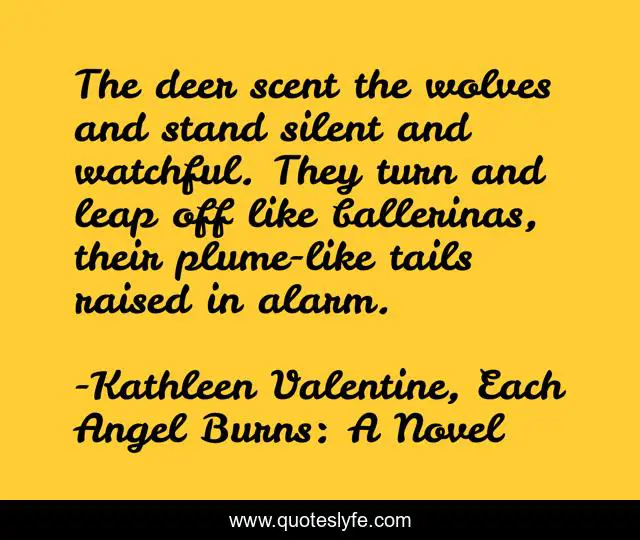 This page presents the quote "The deer scent the wolves and stand silent and watchful. They turn and leap off like ballerinas, their plume-like tails raised in alarm.". Author of this quote is Kathleen Valentine, Each Angel Burns: A Novel. This quote is about wolves, deer, nature-s-beauty, nature,.