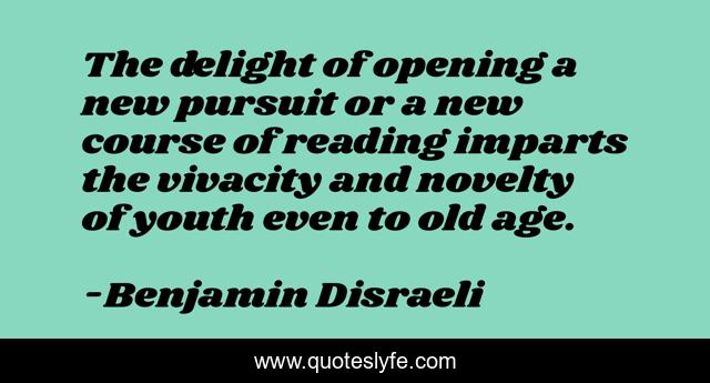 This page presents the quote "The delight of opening a new pursuit or a new course of reading imparts the vivacity and novelty of youth even to old age.". Author of this quote is Benjamin Disraeli. This quote is about books, reading,.