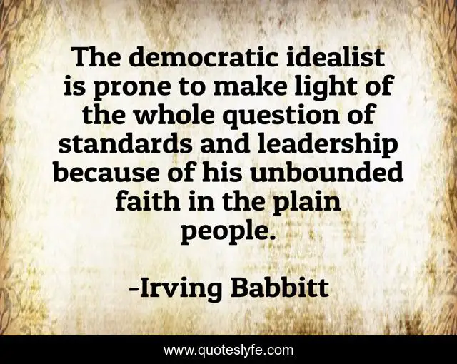 This page presents the quote "The democratic idealist is prone to make light of the whole question of standards and leadership because of his unbounded faith in the plain people.". Author of this quote is Irving Babbitt. This quote is about light, faith, people,.