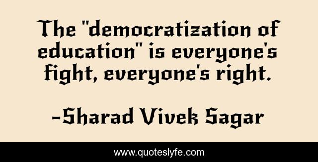 This page presents the quote "The "democratization of education" is everyone's fight, everyone's right.". Author of this quote is Sharad Vivek Sagar. This quote is about right, democracy, fight, democratization, social-entrepreneurship, education, dexterity-global,.