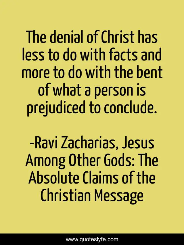 This page presents the quote "The denial of Christ has less to do with facts and more to do with the bent of what a person is prejudiced to conclude.". Author of this quote is Ravi Zacharias, Jesus Among Other Gods: The Absolute Claims of the Christian Message. This quote is about faith, christian, belief, atheist, jesus, religion, prejudice, evidence,.