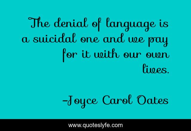 This page presents the quote "The denial of language is a suicidal one and we pay for it with our own lives.". Author of this quote is Joyce Carol Oates. This quote is about communication, writing,.