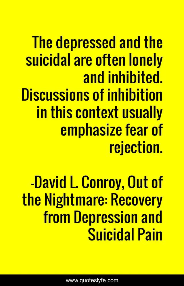 This page presents the quote "The depressed and the suicidal are often lonely and inhibited. Discussions of inhibition in this context usually emphasize fear of rejection.". Author of this quote is David L. Conroy, Out of the Nightmare: Recovery from Depression and Suicidal Pain. This quote is about lonely, rejection, inhibition, suicide, suicidal, fear, depression,.