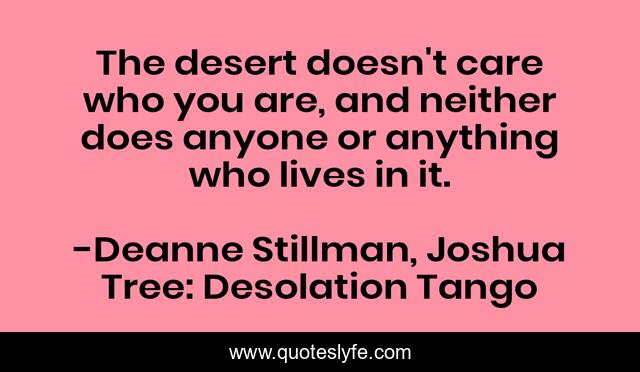This page presents the quote "The desert doesn't care who you are, and neither does anyone or anything who lives in it.". Author of this quote is Deanne Stillman, Joshua Tree: Desolation Tango. This quote is about travel, humor,.
