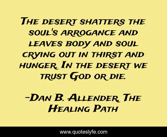 This page presents the quote "The desert shatters the soul's arrogance and leaves body and soul crying out in thirst and hunger. In the desert we trust God or die.". Author of this quote is Dan B. Allender, The Healing Path. This quote is about faith, exodus, christ, egypt, turst, desert, dan-b-allender, healing, god,.