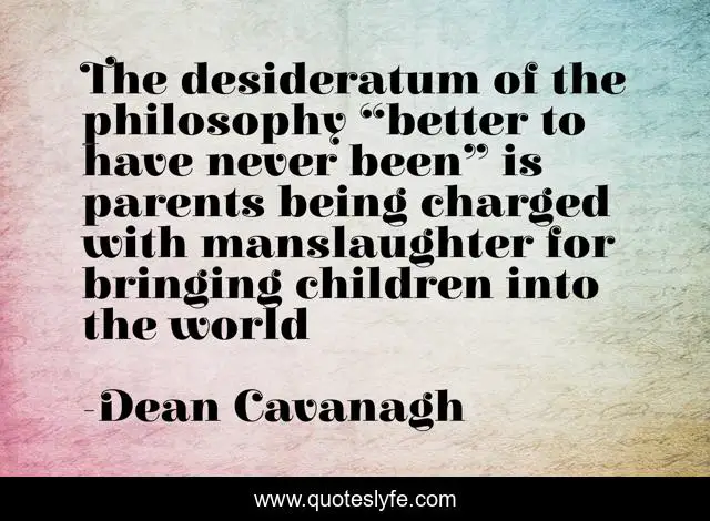 This page presents the quote "The desideratum of the philosophy “better to have never been” is parents being charged with manslaughter for bringing children into the world". Author of this quote is Dean Cavanagh. This quote is about existence, philosophy, procreation,.