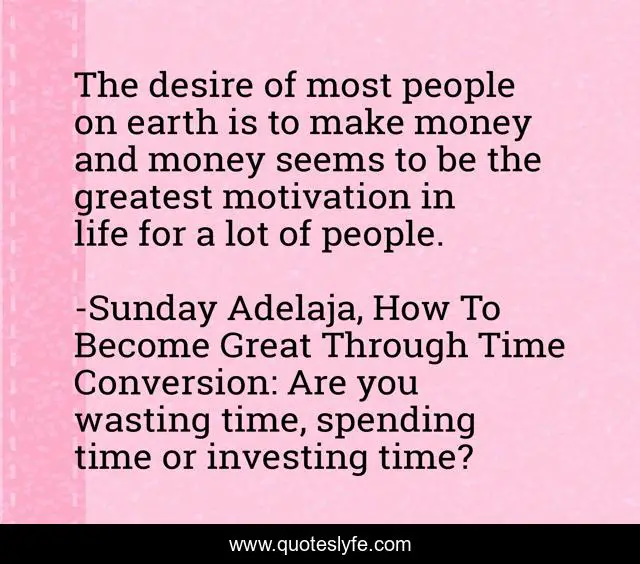 This page presents the quote "The desire of most people on earth is to make money and money seems to be the greatest motivation in life for a lot of people.". Author of this quote is Sunday Adelaja, How To Become Great Through Time Conversion: Are you wasting time, spending time or investing time?. This quote is about motivation, people, wealth-creation, money, product, earth, conversion, productivity, wealth,.