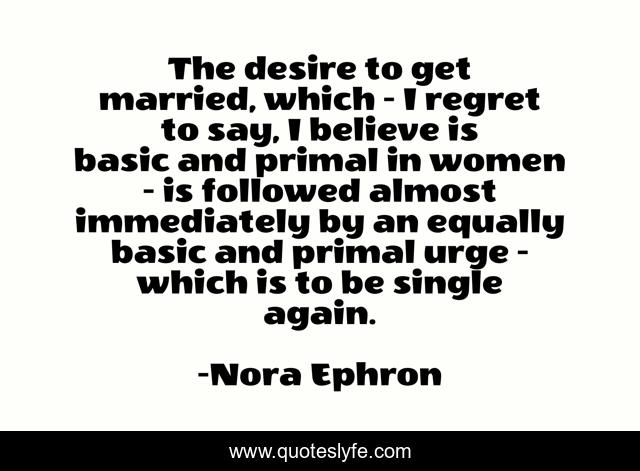 This page presents the quote "The desire to get married, which - I regret to say, I believe is basic and primal in women - is followed almost immediately by an equally basic and primal urge - which is to be single again.". Author of this quote is Nora Ephron. This quote is about believe, regret, women,.
