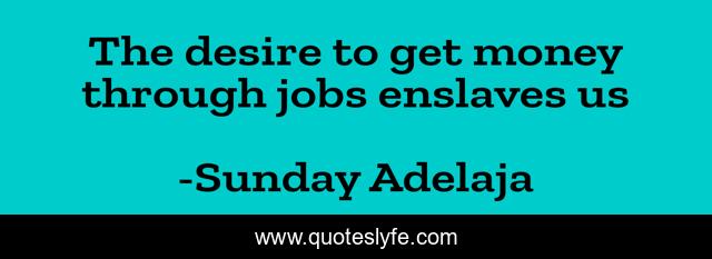 This page presents the quote "The desire to get money through jobs enslaves us". Author of this quote is Sunday Adelaja. This quote is about life, blessing, jobless, money, work, slavery, finance, job, joblessness,.
