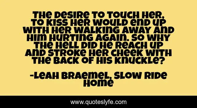 This page presents the quote "The desire to touch her, to kiss her would end up with her walking away and him hurting again. So why the hell did he reach up and stroke her cheek with the back of his knuckle?". Author of this quote is Leah Braemel, Slow Ride Home. This quote is about desire, emotion, romance, love, affection,.