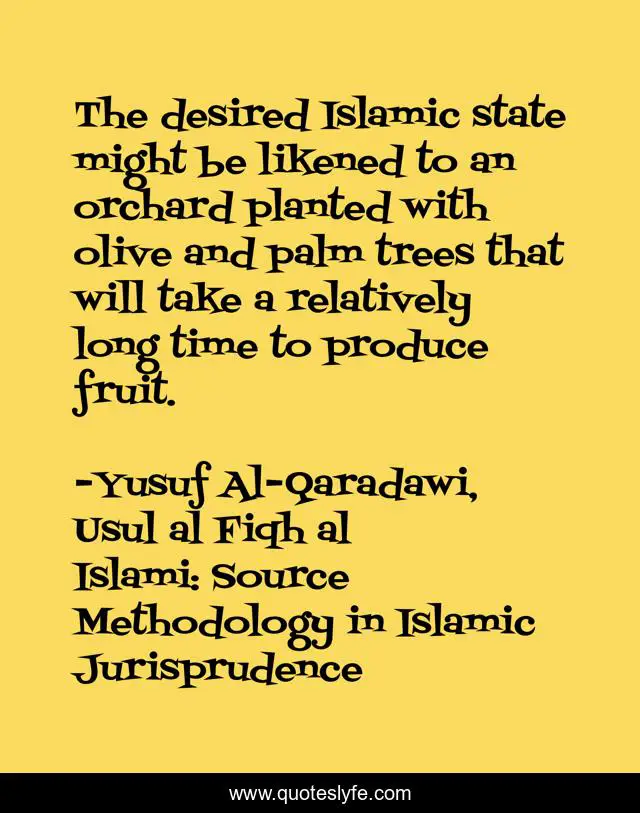 This page presents the quote "The desired Islamic state might be likened to an orchard planted with olive and palm trees that will take a relatively long time to produce fruit.". Author of this quote is Yusuf Al-Qaradawi, Uṣūl al Fiqh al Islāmī: Source Methodology in Islamic Jurisprudence. .