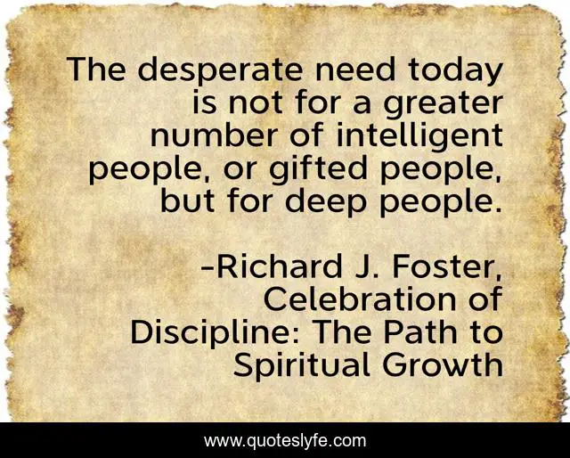 This page presents the quote "The desperate need today is not for a greater number of intelligent people, or gifted people, but for deep people.". Author of this quote is Richard J. Foster, Celebration of Discipline: The Path to Spiritual Growth. .