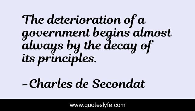 "Charles de Secondat Quotes." Quoteslyfe.com, 2025. Sat. 06 Dec. 2025. <https://www.quoteslyfe.com/quote/The-deterioration-of-a-government-begins-almost-321033>.
