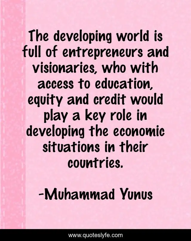 This page presents the quote "The developing world is full of entrepreneurs and visionaries, who with access to education, equity and credit would play a key role in developing the economic situations in their countries.". Author of this quote is Muhammad Yunus. This quote is about world, play, equity,.