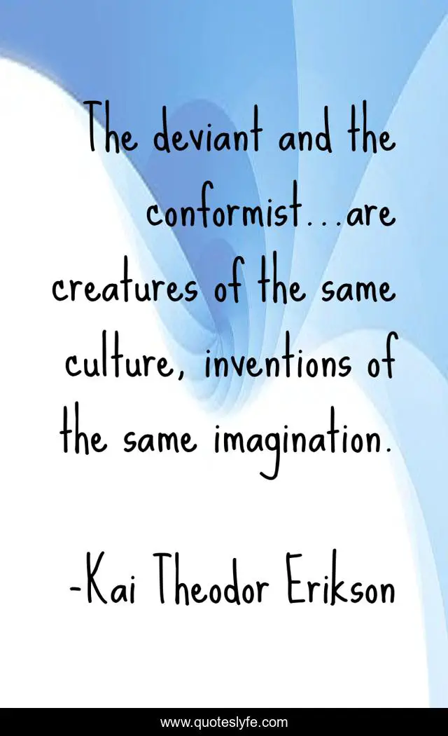 This page presents the quote "The deviant and the conformist...are creatures of the same culture, inventions of the same imagination.". Author of this quote is Kai Theodor Erikson. This quote is about sociology, criminology, deviance,.