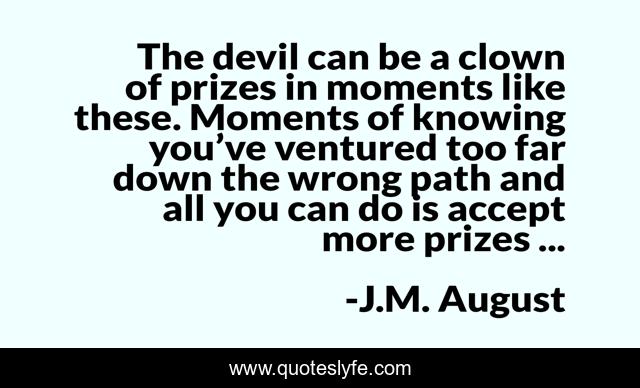 This page presents the quote "The devil can be a clown of prizes in moments like these. Moments of knowing you’ve ventured too far down the wrong path and all you can do is accept more prizes ...". Author of this quote is J.M. August. This quote is about failure, success,.
