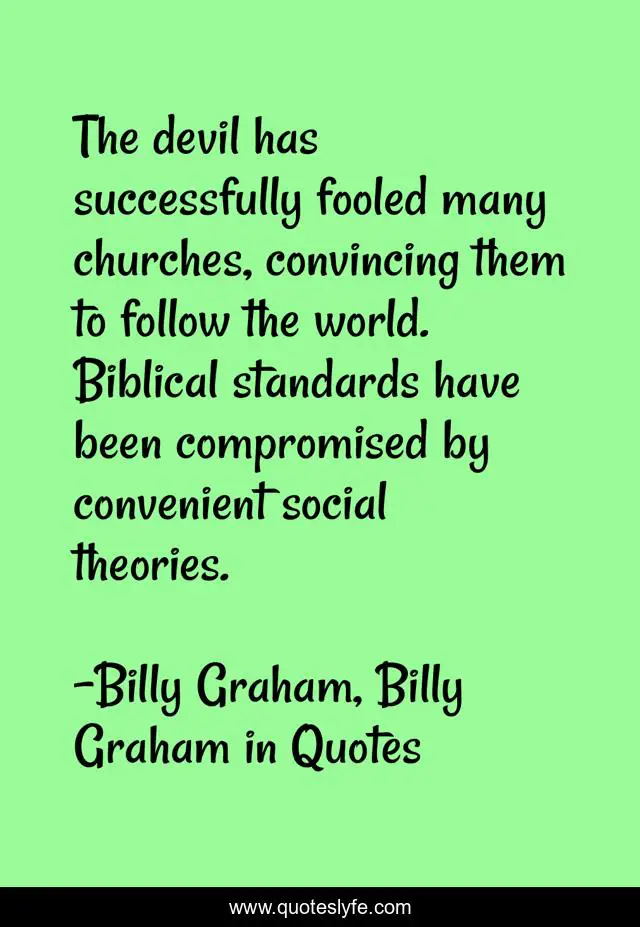 This page presents the quote "The devil has successfully fooled many churches, convincing them to follow the world. Biblical standards have been compromised by convenient social theories.". Author of this quote is Billy Graham, Billy Graham in Quotes. This quote is about compromise, billy-graham,.