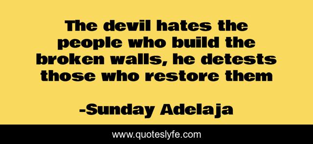 This page presents the quote "The devil hates the people who build the broken walls, he detests those who restore them". Author of this quote is Sunday Adelaja. This quote is about life, righteous, builders, devil-s-hatred, purpose,.