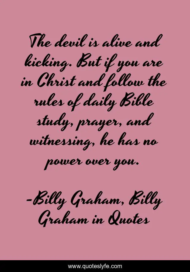 This page presents the quote "The devil is alive and kicking. But if you are in Christ and follow the rules of daily Bible study, prayer, and witnessing, he has no power over you.". Author of this quote is Billy Graham, Billy Graham in Quotes. This quote is about devil, satan, billy-graham,.