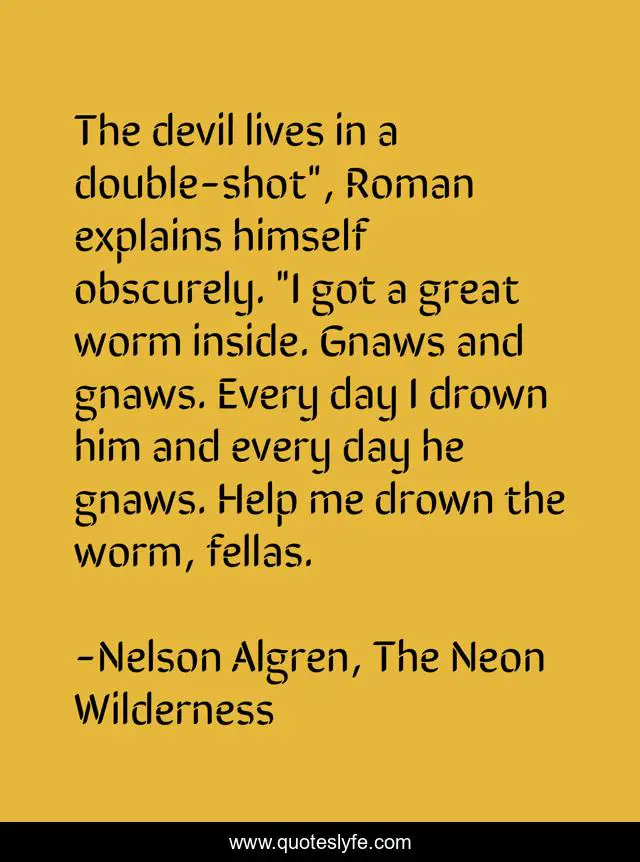 This page presents the quote "The devil lives in a double-shot", Roman explains himself obscurely. "I got a great worm inside. Gnaws and gnaws. Every day I drown him and every day he gnaws. Help me drown the worm, fellas.". Author of this quote is Nelson Algren, The Neon Wilderness. This quote is about drink, alcohol,.