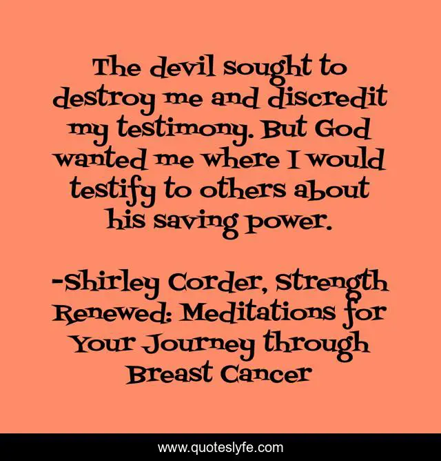 This page presents the quote "The devil sought to destroy me and discredit my testimony. But God wanted me where I would testify to others about his saving power.". Author of this quote is Shirley Corder, Strength Renewed: Meditations for Your Journey through Breast Cancer. This quote is about god, christian, cancer, inspirational, enthusiasm,.