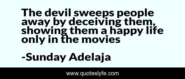 This page presents the quote "The devil sweeps people away by deceiving them, showing them a happy life only in the movies". Author of this quote is Sunday Adelaja. This quote is about deceit, devil, happy,.
