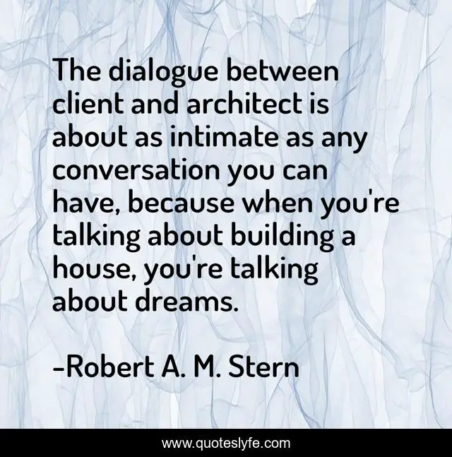 This page presents the quote "The dialogue between client and architect is about as intimate as any conversation you can have, because when you're talking about building a house, you're talking about dreams.". Author of this quote is Robert A. M. Stern. This quote is about conversation, architecture,.