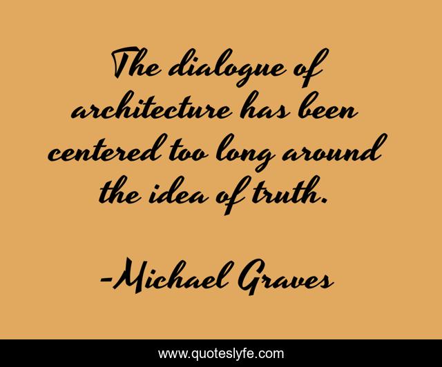 This page presents the quote "The dialogue of architecture has been centered too long around the idea of truth.". Author of this quote is Michael Graves. This quote is about dialogue, truth, long,.