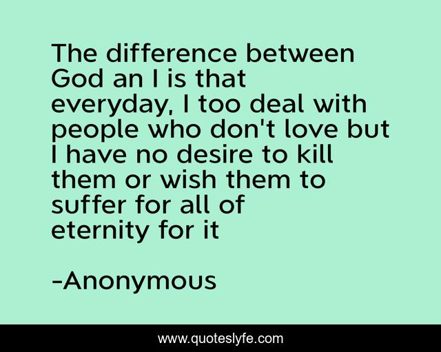 This page presents the quote "The difference between God an I is that everyday, I too deal with people who don't love but I have no desire to kill them or wish them to suffer for all of eternity for it". Author of this quote is Anonymous. .