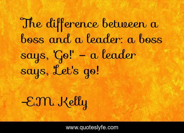 This page presents the quote "The difference between a boss and a leader: a boss says, 'Go!' – a leader says, 'Let's go!". Author of this quote is E.M. Kelly. This quote is about leadership, leader, boss,.