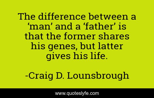 This page presents the quote "The difference between a ‘man’ and a ‘father’ is that the former shares his genes, but latter gives his life.". Author of this quote is Craig D. Lounsbrough. This quote is about sacrificial, fatherhood, family, commitment, legacy, genes, families, giving, father,.