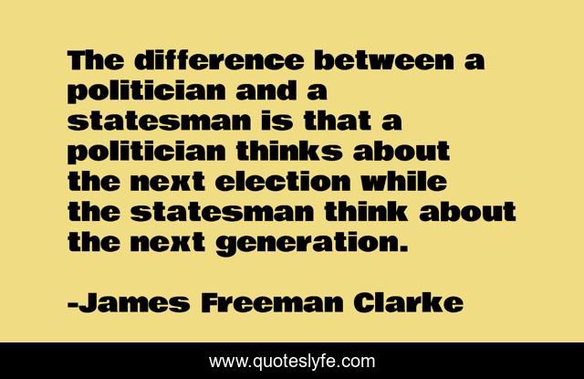 This page presents the quote "The difference between a politician and a statesman is that a politician thinks about the next election while the statesman think about the next generation.". Author of this quote is James Freeman Clarke. This quote is about politics, politicians, statesmen,.