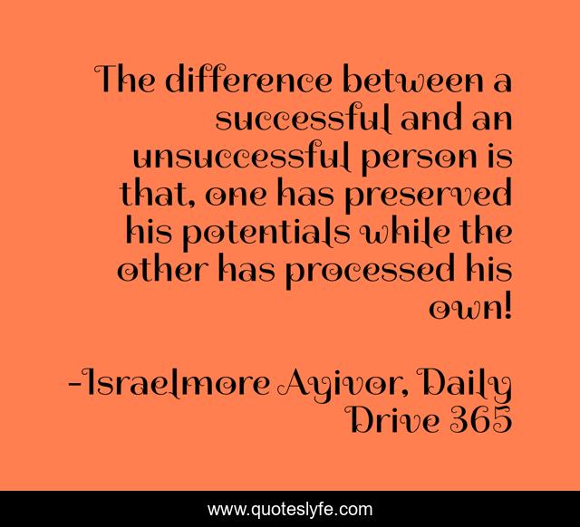 This page presents the quote "The difference between a successful and an unsuccessful person is that, one has preserved his potentials while the other has processed his own!". Author of this quote is Israelmore Ayivor, Daily Drive 365. This quote is about achievements, food-for-thought, dream-big, reservoir, achievers, successful, success, failure, use-your-gifts,.