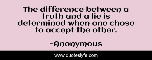 This page presents the quote "The difference between a truth and a lie is determined when one chose to accept the other.". Author of this quote is Anonymous. This quote is about lies, society, truths, truth, lie,.