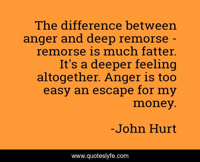This page presents the quote "The difference between anger and deep remorse - remorse is much fatter. It's a deeper feeling altogether. Anger is too easy an escape for my money.". Author of this quote is John Hurt. This quote is about money, deep, easy,.