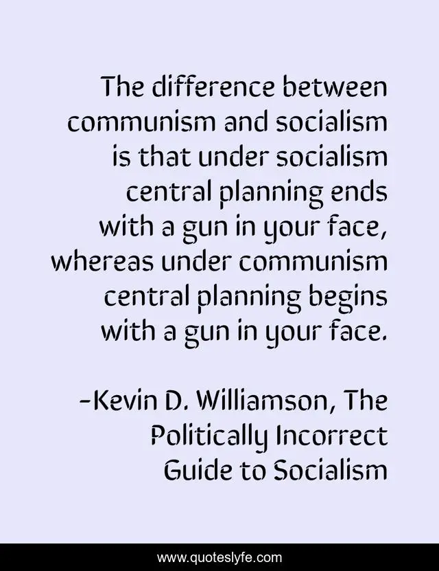 This page presents the quote "The difference between communism and socialism is that under socialism central planning ends with a gun in your face, whereas under communism central planning begins with a gun in your face.". Author of this quote is Kevin D. Williamson, The Politically Incorrect Guide to Socialism. This quote is about communism, socialism,.