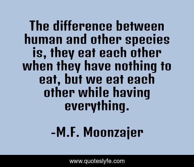 This page presents the quote "The difference between human and other species is, they eat each other when they have nothing to eat, but we eat each other while having everything.". Author of this quote is M.F. Moonzajer. This quote is about everything, difference, humans, species,.
