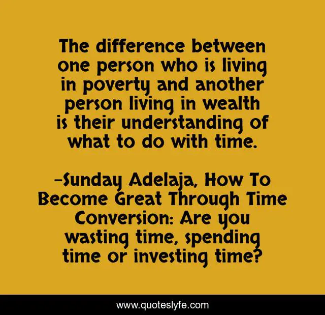 This page presents the quote "The difference between one person who is living in poverty and another person living in wealth is their understanding of what to do with time.". Author of this quote is Sunday Adelaja, How To Become Great Through Time Conversion: Are you wasting time, spending time or investing time?. This quote is about life, conversion, productivity, knowledge, greatness, waste, humanity, product, great,.