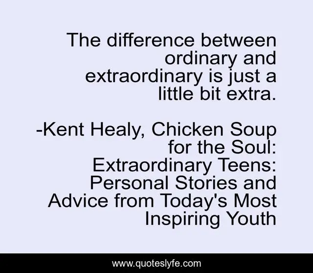 This page presents the quote "The difference between ordinary and extraordinary is just a little bit extra.". Author of this quote is Kent Healy, Chicken Soup for the Soul: Extraordinary Teens: Personal Stories and Advice from Today's Most Inspiring Youth. This quote is about chicken-soup-for-the-soul, youth, teens, inspirational, enthusiasm,.