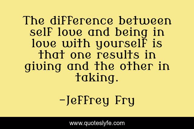 This page presents the quote "The difference between self love and being in love with yourself is that one results in giving and the other in taking.". Author of this quote is Jeffrey Fry. This quote is about self-love, with-yourself, giving, taking, results, being-in-love, between, difference,.