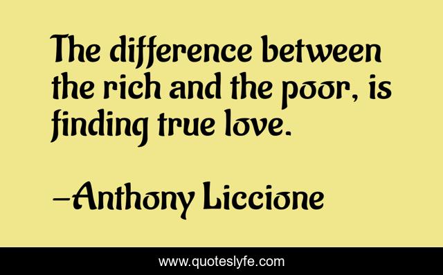 This page presents the quote "The difference between the rich and the poor, is finding true love.". Author of this quote is Anthony Liccione. This quote is about fool, poor, gigolo, users, relationships, money, riches, greedy, sponge,.