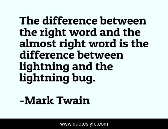 This page presents the quote "The difference between the right word and the almost right word is the difference between lightning and the lightning bug.". Author of this quote is Mark Twain. This quote is about words, language,.
