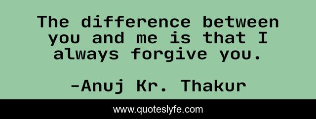 This page presents the quote "The difference between you and me is that I always forgive you.". Author of this quote is Anuj Kr. Thakur. This quote is about motivation, courage, friendship, truth,.