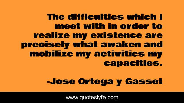 This page presents the quote "The difficulties which I meet with in order to realize my existence are precisely what awaken and mobilize my activities my capacities.". Author of this quote is Jose Ortega y Gasset. .