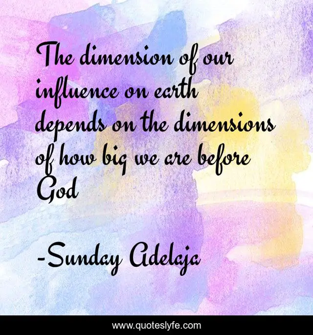 This page presents the quote "The dimension of our influence on earth depends on the dimensions of how big we are before God". Author of this quote is Sunday Adelaja. This quote is about depend, big, influence, god, earth, dimension,.